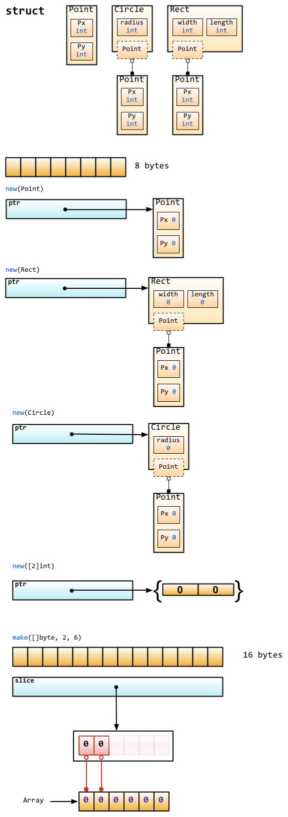 下面这张图来源于Russ Cox Blog中一篇介绍Go数据结构的文章,大家可以看到这些基础类型底层都是分配了一块内存,然后存储了相应的值。