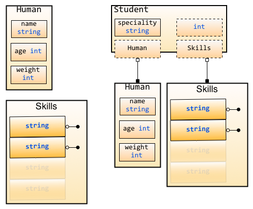 图2.7 struct组合,Student组合了Human struct和string基本类型