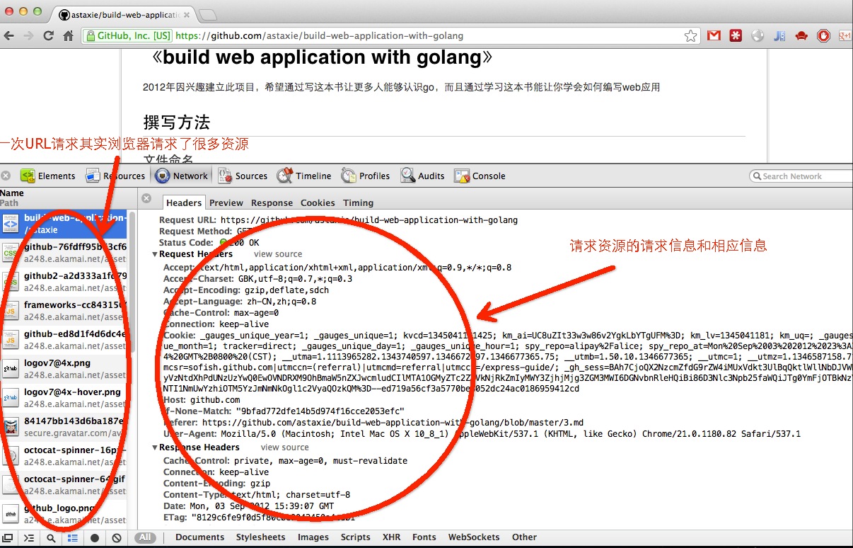 上面这张图我们可以了解到整个的通讯过程,同时细心的读者是否注意到了一点,一个URL请求但是左边栏里面为什么会有那么多的资源请求(这些都是静态文件,go对于静态文件有专门的处理方式)。