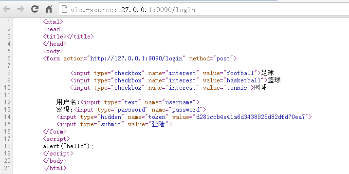 <input type="submit" value="登陆">我们在模版里面增加了一个隐藏字段token,这个值我们通过MD5(时间戳)来获取唯一值,然后我们把这个值存储到服务器端(session来控制,我们将在第六章讲解如何保存),以方便表单提交时比对判定。
