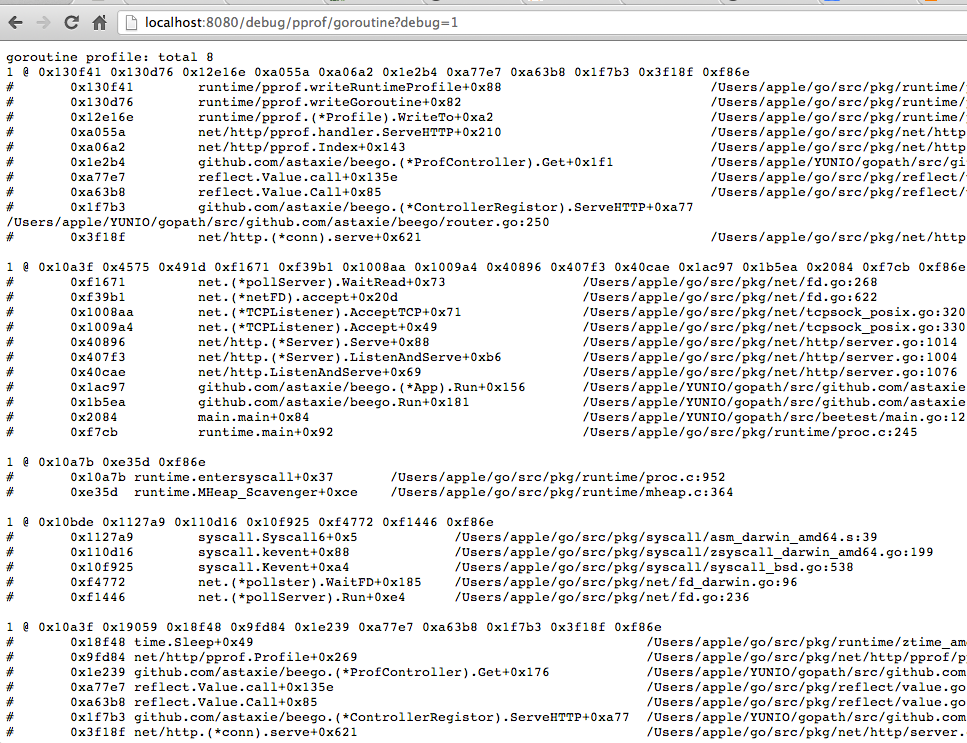 目前beego框架新增了pprof,该特性默认是不开启的,如果你需要测试性能,查看相应的执行goroutine之类的信息,其实Go的默认包"net/http/pprof"已经具有该功能,如果按照Go默认的方式执行Web,默认就可以使用,但是由于beego重新封装了ServHTTP函数,默认的包是无法开启该功能的,所以需要对beego的内部改造支持pprof。